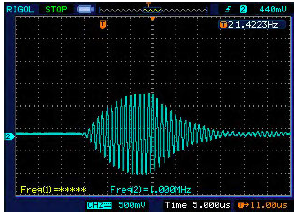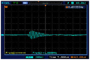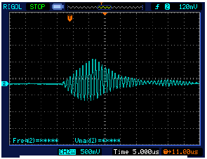 在超聲波流量測量時,首先要對換能器進行驅動,激勵換能器產生振蕩并發(fā)出超聲波信號,以下是分別采用1個驅動脈沖、10個驅動脈沖和15個驅動脈沖作為換能器的激勵源,圖2是1個驅動脈沖時,接收端換能器所接收到的波形。可以看出,當一個脈沖驅動時,所接收到的波形比較微弱,波形很不規(guī)范。圖3是10個驅動脈沖時,接收端換能器所接收到的波形。波形形狀得到明顯改善。圖4是15個驅動脈沖時,接收端換能器所接收到的波形。